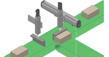 利用單軸電動滑臺組合成XY機(jī)構(gòu),在輸送帶上方執(zhí)行物品的搬運(yùn)作業(yè)。